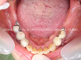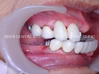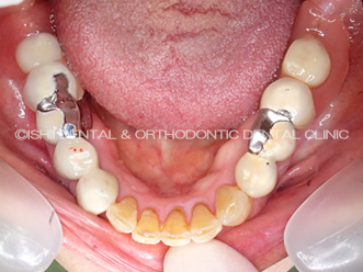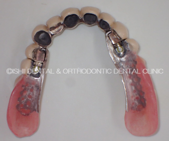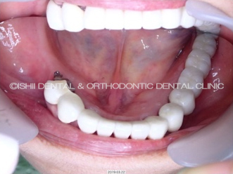 下顎の補綴物を全て外し、崩壊した咬合を再建して、安定と強度に優れたアタッチメント義歯を装着。