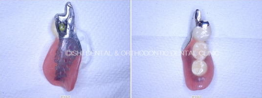 バネの付いた入れ歯は目立つだけで無く不安定で食べる事が出来ないという事なので、特殊なアタッチメントを使用した義歯を使用した設計で咬合再建を行いました。